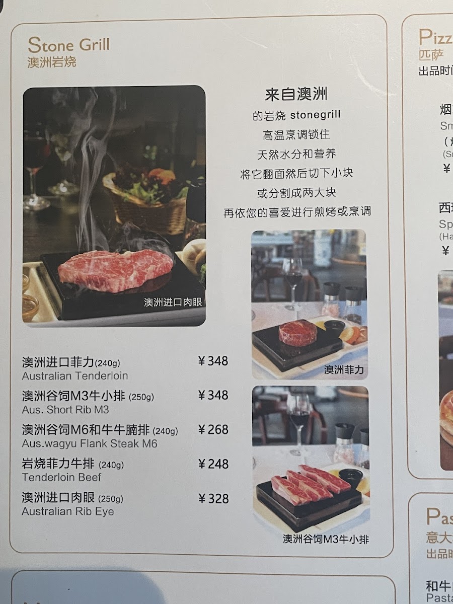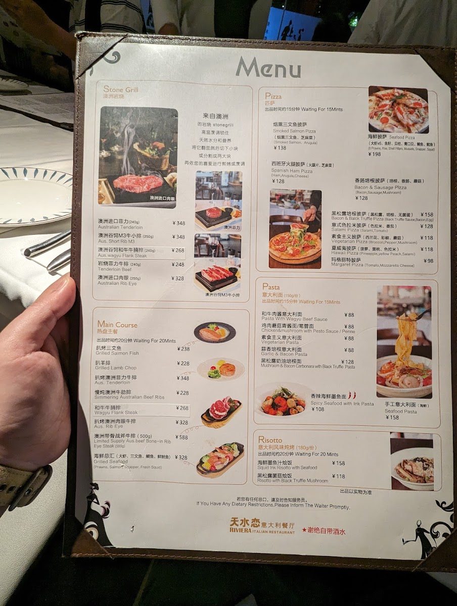 The food offerings include pasta dishes and pizzas, reflecting traditional Italian culinary choices. One highlighted dish from the menu is pasta with Wagyu beef sauce, indicating some specialty or premium options. While specific menu details are limited, general categories likely cover appetizers, main courses, and possibly desserts to complement the meal.